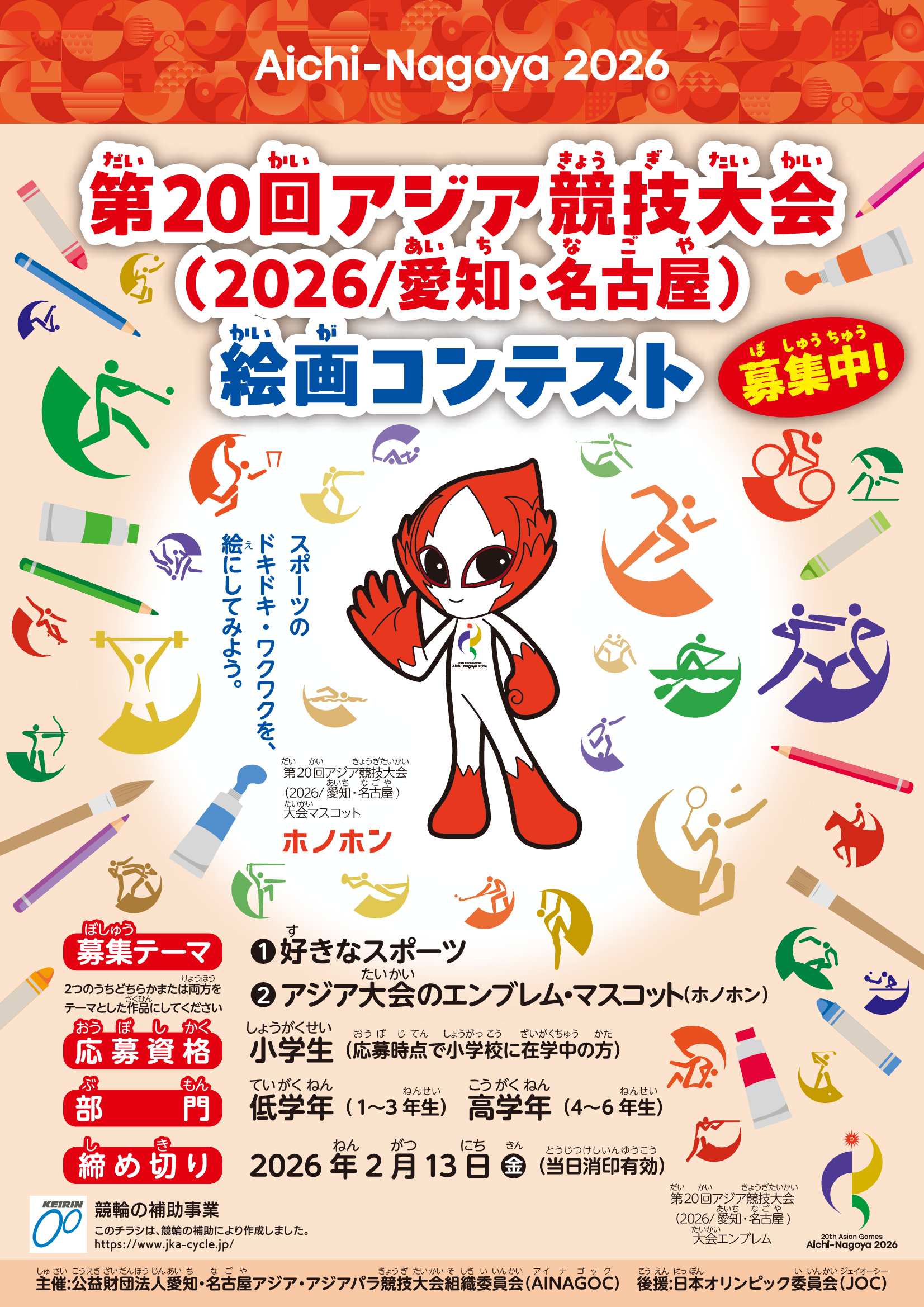 愛知・名古屋アジア・アジアパラ競技大会組織委員会(AINAGOC)が主催する「アジア競技大会絵画コンテスト」のチラシです。応募締め切りは2月13日(金)です。 |
