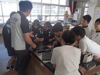 5・6年生は、理科室で木の板に釘を打ったり、その釘を抜いたりしています。「てこのはたらき」の授業を行っていました。