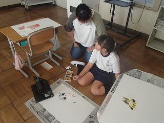 2年生の教室では、図画工作の授業で、動物の絵を描いていました。
