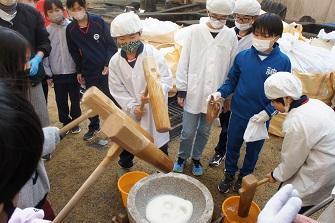 5年生が、もちつき大会を開きました。春の田植えから秋の収穫・脱穀まで、地域の方の協力を得ながら育てた大切なもち米を使ってのもちつき大会でした。