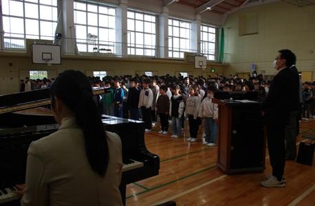 1月7日(水)午前、体育館に全校児童が集まって、3学期の始業式を行いました。代表の児童が、3学期にある縄跳び大会や学習面など、それぞれが頑張りたいことを発表しました。校長先生からは、「今年の干支「午」には、「飛躍」「前進」の意味が込められています。それぞれの目標に向かってぐんぐん進んでいく年にしてください」とお話がありました。また、式の前に、表彰の伝達もありました。寒さ厳しい日が続くようですが、健康に気をつけて3学期もがんばっていきましょう。