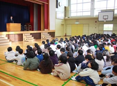 12月17日(水)昼、体育館で保健委員会の全校集会を行いました。冬らしい日が多くなって、かぜやインフルエンザにかかる子も目立ちます。毎日元気で過ごせるように「元気のコツ」を考える集会です。保健委員の子たちが、うがい・手洗い、換気、早寝早起き、バランスのよい食事など元気のコツを紹介してくれました。クイズや体をほぐして温めるストレッチ運動もみんなでやってみました。少し動いただけでも、体が温かくなりました。その後で、今月の歌「チャレンジ」を元気よく歌いました。元気に体を動かし、元気な声で歌って、かぜやインフルエンザにも負けませんね。