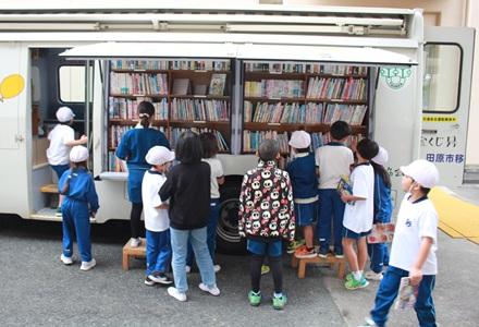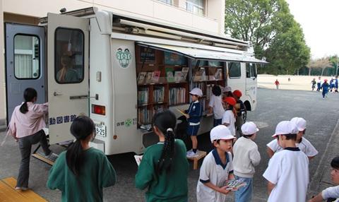 11月5日(水)昼休み、田原市移動図書館「いずみ号」が来ました。小雨が降り出していたので、昇降口や渡り廊下下を使って、図書の貸出や返却をしました。学校図書館にはない本もあって、子どもたちもとても楽しみにしています。