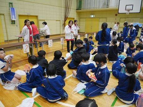 10月29日(水)、学校へボランティア活動等で来ていただいている方を対象に、給食試食会を行いました。これまで子どもたちの様子を見ていただいていますが、給食についてはあまり見ていただく機会がありませんでした。給食もかつてとは随分と変わってきているので、実際の様子を見ていただく機会として行いました。栄養教諭から、現在の給食の様子や食育について説明しました。参加された方から、食物アレルギーや給食費等について質問がありました。この日の献立は、「すいとん」「ぶりの竜田揚げ」「ごまあえ」でした。参加していただいた、ボランティアの皆様、ありがとうございました。