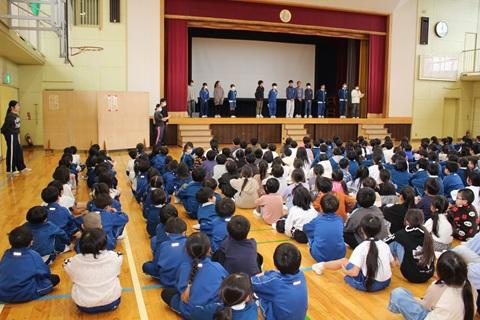 12月17日(水)昼、体育館で保健委員会の全校集会を行いました。冬らしい日が多くなって、かぜやインフルエンザにかかる子も目立ちます。毎日元気で過ごせるように「元気のコツ」を考える集会です。保健委員の子たちが、うがい・手洗い、換気、早寝早起き、バランスのよい食事など元気のコツを紹介してくれました。クイズや体をほぐして温めるストレッチ運動もみんなでやってみました。少し動いただけでも、体が温かくなりました。その後で、今月の歌「チャレンジ」を元気よく歌いました。元気に体を動かし、元気な声で歌って、かぜやインフルエンザにも負けませんね。