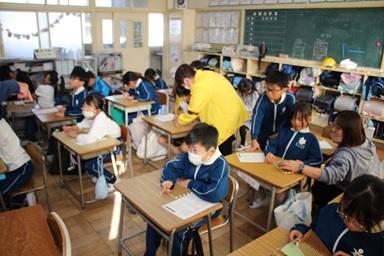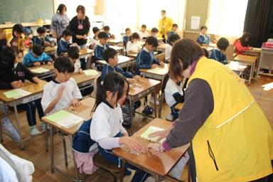 11月19日(水)午後、3年生が、総合的な学習の時間に「福祉実践教室」として、視覚障害者支援の「さくらんぼ」の方に来ていただいて視覚障害について学びました。点字の打ち方や白杖を使った体験、点字ブロックなど、目の不自由な方が、どんなことに困っていたり、どうしてほしいのかなどのお話を聞いたり、体験したりしました。最後に、「さくらんぼ」で活動されている柳田はるかさんの歌を聞いたり、一緒に歌ったりしました。子どもたちは、普段目にしている点字ブロックの意味や目の不自由な方の生活の様子を改めて知って、たくさん気づくことがあったようした。