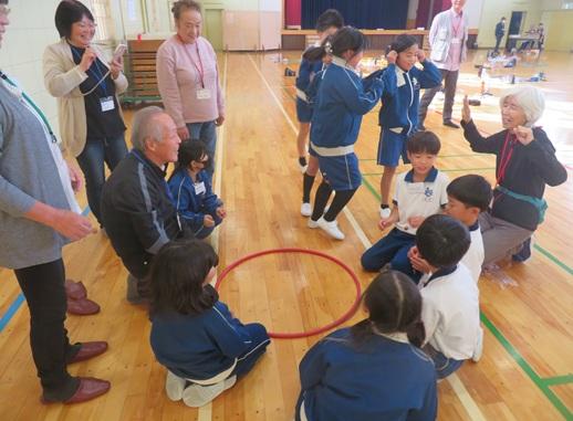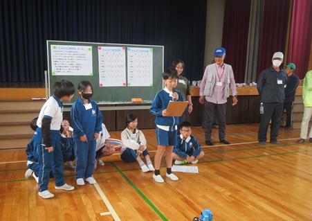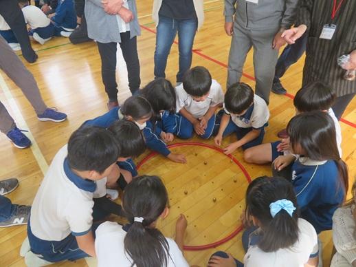 10月29日(水)午後、3年生が体育館で「どんぐりごま大会」をしました。以前に校外学習で見つけてきたどんぐりを使って、こまを作って楽しく遊びました。30人近くの地域のお年寄りの方に来ていただいて、軸となる棒を刺す穴を開けたり、回し方を教えていただいたりしました。すぐにコツをつかんで上手に長く回し続けている子もいて、体育館の中はとてもにぎやかな声であふれていました。秋らしい遊びで楽しい時間を過ごせました。来てくださった皆様、本当にありがとうございました。