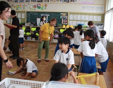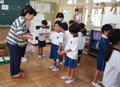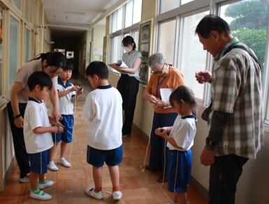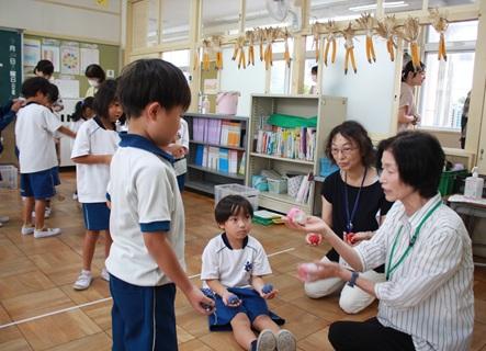 9月24日(水)午後、1年生の学級が、生活科「むかしあそびランドをひらこう」で、地域の方に来ていただいてコツを教えていただきました。けん玉やこま、ヨーヨー、お手玉、だるま落としのグループに分かれて、お手本を見せてもらったり、教えてもらったりしました。たくさんの方に声をかけてもらったり、ほめてもらったりして、どの子もだんだん上手になってきました。できるようになるとうれしいですね。ご協力いただいた皆様、本当にありがとうございました。