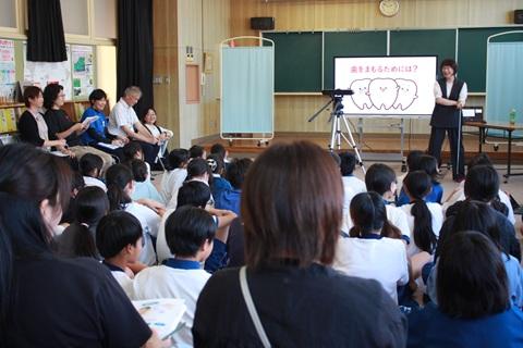 9月26日(金)午後、「むし歯にならないための食べ方の選択と食べ方について」をテーマに保健委員会が中心となって、学校保健委員会を行いました。保健委員の子たちが、歯磨きについて啓発の劇を見せてくれました。その後、歯科衛生士の先生から「めざそう!健康な歯でピカピカ笑顔!!」を演題にお話をしていただきました。6年生は学習室でお話を聞き、1〜5年生はオンライン形式で各教室でお話を聞きました。子どもたちは、歯磨きをしないと体にどんな影響がでるのかを聞いて、健康な歯の大切さを改めて感じている様子でした。