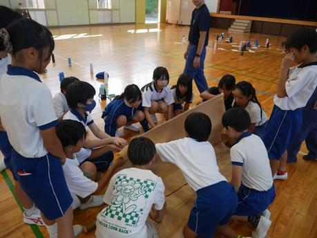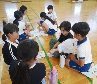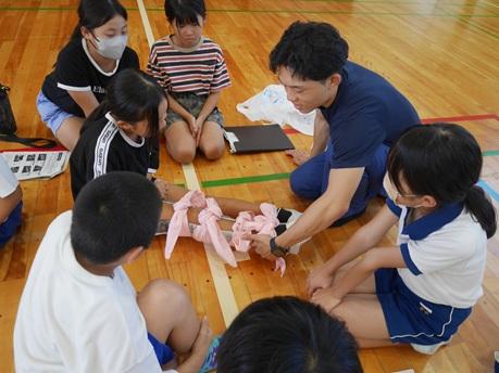9月30日(火)午後、5年生が田原消防署の方に来ていただいて、応急手当講座を行いました。災害時などで救急車がすぐには着かなかったり、病院にもすぐに行けない場合、身近にあるもので応急手当をするための講座です。三角巾やビニル袋、新聞紙、毛布を使ったりして手当をします。止血をする方法や骨折した部分を固定する方法、担架を作る方法などを教えていただき、実際に体験してみました。初めは戸惑っていましたが、何度も見たりやってみたりしてだんだんとできるようになっていきました。万が一の場合に役に立つといいですね。