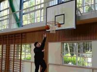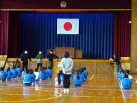 また、田原ロータリークラブから寄贈されたバスケットボールの紹介がありました。クイズ形式で「バスケットボールが得意な先生は誰か」と問題が出され、3年生担任の先生が見事にシュートを決め、たいへん盛り上がりました。