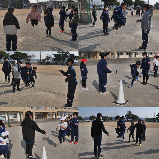 1月14日(火)、16日(木)、なかやまタイム(昼休み)に、長縄交流会を行いました。児童会の企画で、なかよし班(縦割り班)毎に、長縄跳びを楽しむ活動です。縄は高学年の子どもたちが回します。まだ長縄跳びに慣れていない低学年の子どもたちが跳べるように、やさしく声掛けをする姿が、あちらこちらで見られました。