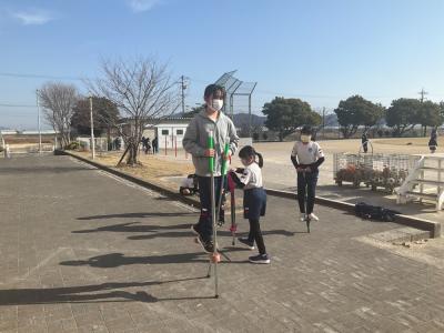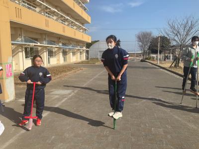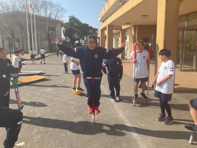 「校長先生!見て見て!」中には、両手を離してホッピングをとぶ名人もあらわれました。