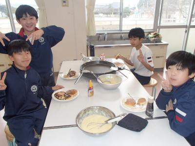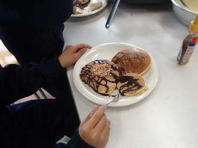 ホットケーキを焼いて、「おいしい!」と笑顔になる子。