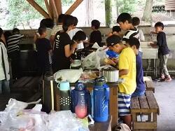 一日目の目玉は,飯ごう炊飯のカレーライスづくりとキャンプファイヤーでした。雨上がりのため炊事場は蒸し蒸ししていて,普段の生活環境とは違う中での飯ごう炊飯は大変でした。しかし,どの班も協力し助け合って仕事に取り組む姿が見られました。できあがったカレーは,「カレースープ」ではなく,水の量をしっかり加減でき,おいしいカレーができました。キャンプファイヤーでは,途中,少し雨に降られましたが,すぐに止み,計画していたダンスやゲームなどのスタンツを,予定通りにすべて行うことができました。