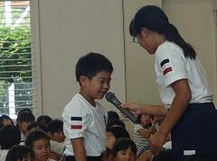 7月19日木曜日のなかやまタイムに,21日(土)に行われる田原市水泳大会の選手激励会が体育館で行われました。例年は,プールサイドで行う行事ですが,今年はブロック塀の危険性と暑さ対策から,体育館で行うことになりました。司会・運営の中心は,アンドリ部の5年生。はじめに,選手として出場する子どもたちが,一言ずつ大会に向けての目標を述べました。その後は水泳部キャプテンの琉生くんと麗菜さんによる抱負の発表でした。激励の応援では,団長の5年悠太君が大きな声で音頭を取り,士気を高める応援をしてくれました。そして,最後は校長先生からの励ましの言葉でした。