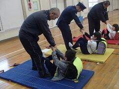 体験は,不審者に出会ったら大声を出すとともに防犯ブザーを鳴らすこと,腕を捕まれたときの対処法・逃げ方などを行いました。いざというときに大きな声を出すことができない場合もあります。そういうときは防犯ブザーを鳴らしながら逃げることが重要です。