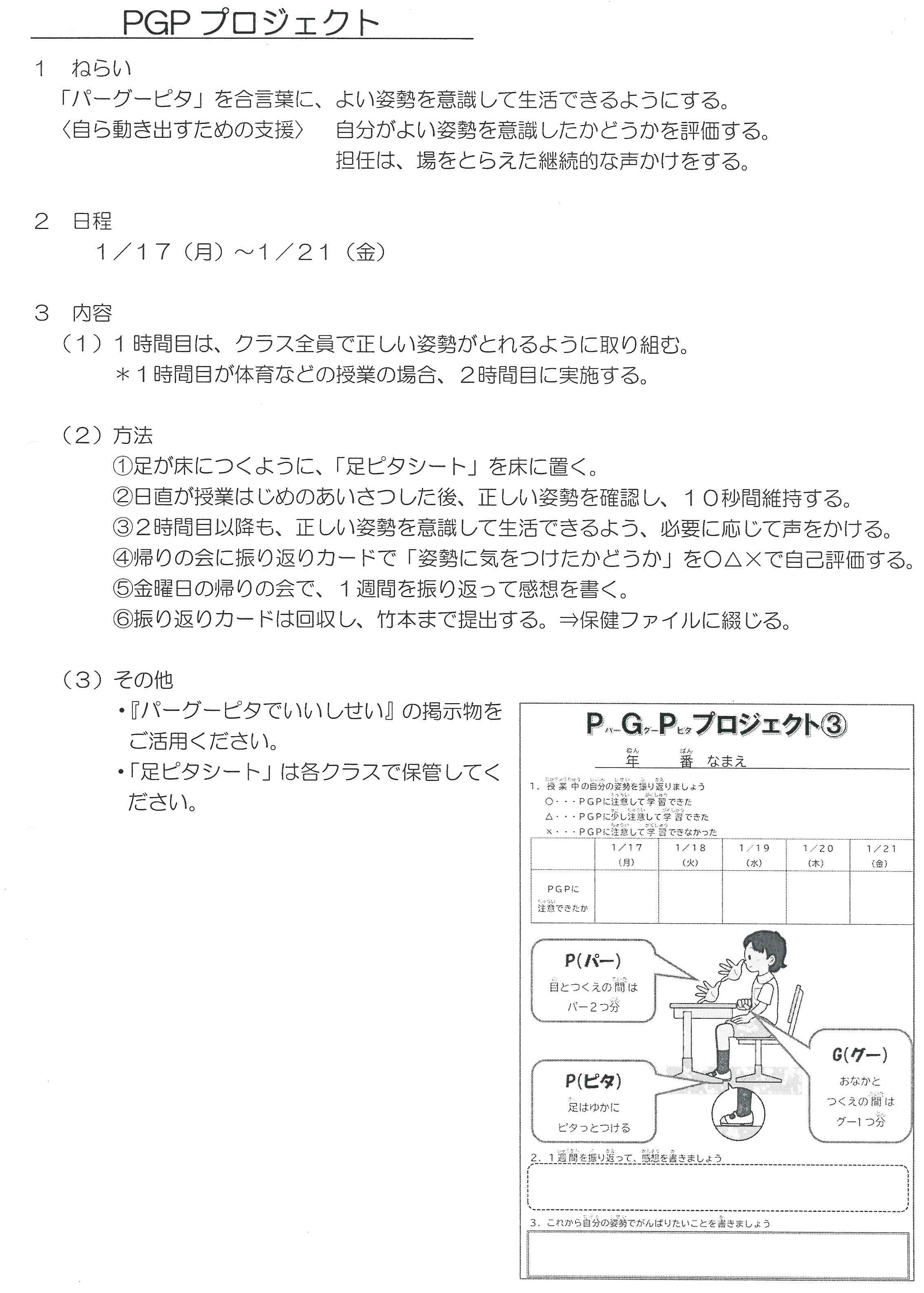 本校では、1/17(月)から1/21(金)まで、「PGPプロジェクト」を実施しています。「パーグーピタ」を合言葉に、良い姿勢を意識して生活できることを目的として、児童たちは取り組んでいます。