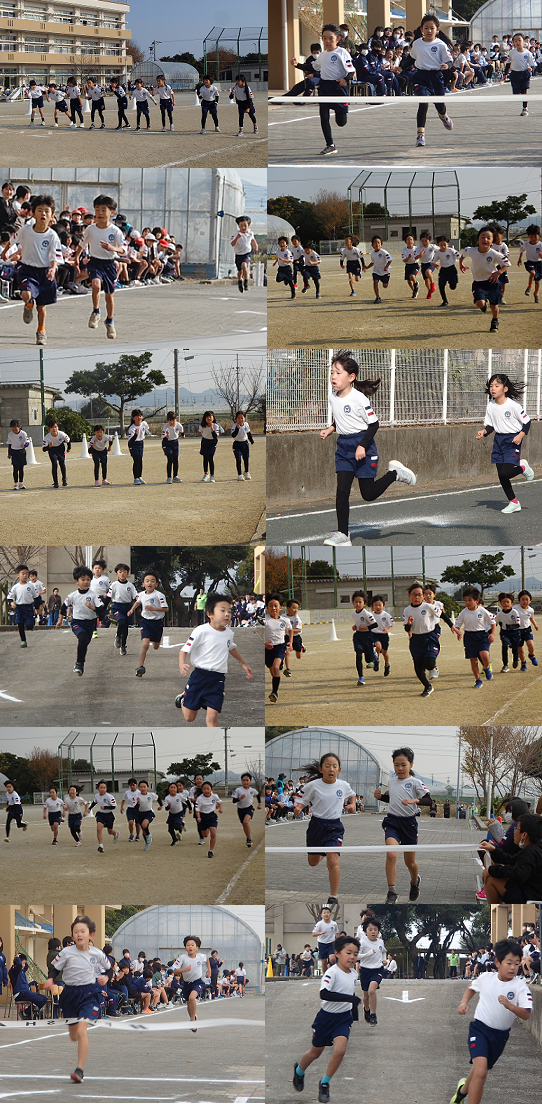 12月7日(木)、校内持久走大会を行いました。おだやかな天気の下(高学年が走るときには、風が強くなってきましたが)、子どもたちはそれぞれ、力一杯の走りを見せてくれました。福江交番長さんをはじめ、交通ボランティアや交通指導員の方、PTA役員の皆さんに見守っていただき、そしてたくさんの保護者の方の声援を受けて、子どもたちは最後まで一生懸命走りました。