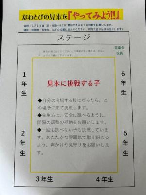 次の朝会で、なわとびの見本をやってくれる人を募集する、というお知らせでした。