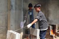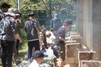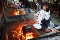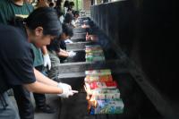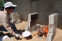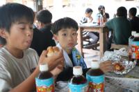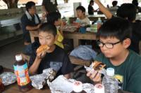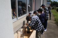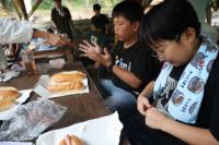 かまど係は、飯盒とホットドックの準備を行い、体育館横のかまどで火を起こしました。初めのうちは新聞紙ばかりが燃え、なかなか木に火がつきませんでしたが、なんとか火を起こすことができました。照りつける太陽と薪の火や煙で大変な思いをしました。