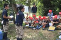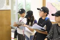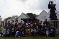 退村式を行い、県民の森を後にしました。新城総合公園で昼食を食べ、広場で遊んだ後、最後の目的地である設楽ヶ原歴史資料館へ。「長篠合戦図屏風」の説明を聞いたり、兜をかぶり火縄銃を持って記念撮影を撮ったりしました。説明の中で、「長篠合戦図屏風」にある大御所芸人のご先祖様が描かれていることを聞いてビックリ!