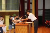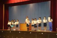 コミュニティ会長と健全育成会の方に来校していただき、夏休みに応募した一口メッセージの表彰が行われました。