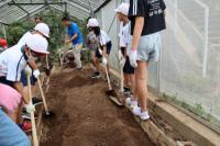温室の土に肥料をまいて耕し、畝を作り、苗を植えていきました。