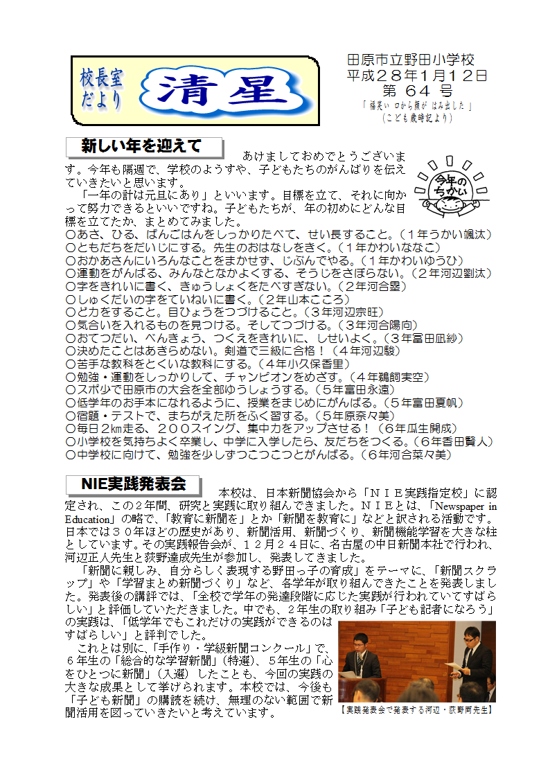 ました。上級生は,お手本になるよう,気合を入れて「誓いの言葉」を言うことができました。「がんばろう・助け合おう・ためになろう」の気持ちで,楽しい学校生活を送ることができるように願っています。
