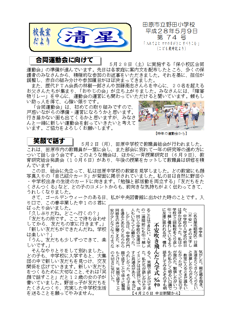 校長だより 清星第74号