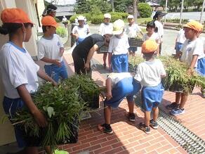 7月3日(水)大草タイムで七夕飾りづけをしました。縦割り班ごとに分かれて、願い事を書いた短冊を6年生の指示で、竹に飾りつけました。「すもうが強くなりますように・・・」「足がはやくなりますように・・・」「家族が健康でいられますように・・」様々な願い事が書かれてありました。うまくつけることができない1年生に上級生が手を添えていっしょにつけている様子は、心温まる場面でした。