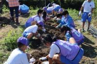 6月につるさしをしたいも畑でいもほり集会が行われました。縦割り班で分かれ、自分たちが植えたところを掘りました。大きなお芋を掘り出すことに悪戦苦闘したり、友達の大きなお芋に「めちゃでかい!」と驚いたりと、みんなで楽しく芋掘りをすることができました。サツマイモらしい細長いお芋は少なく、どっしりとした大きなお芋がたくさんとれました。どの班もかごいっぱいにお芋を収穫することができました。収穫したお芋はみんなで仲よく分けました。