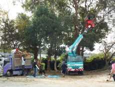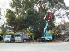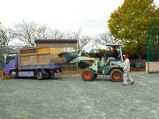 11月8日(土)に、PTA男性委員、コミュニティの方に協力していただき、運動場南側の高木伐採作業を行いました。今年は、ドリームスカイタワー横にある運動場で一番高い樹木の伐採でした。樹木伐採では手際よく高い枝を次から次へと切り落としていました。切り落とされた枝が地面に落ちてくると、ズシーンという音が鳴り響きました。また、ウサギ小屋横や芋畑にある落ち葉を捨てる場所も、ショベルカーできれいにしていただけました。職員だけではなかなか作業できない場所をPTA委員さんや地域の方のおかげで片付けることができました。運動場南側がすっきりしました。