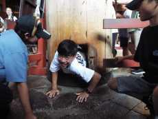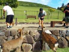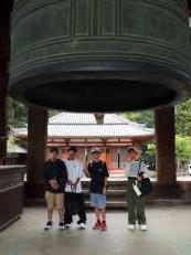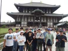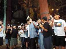 修学旅行1日目は、7時に大草市民館を出発。バスの中では、おかしを食べたり、カラオケをしたりして盛り上がりました。11時10分に白銀屋で洋食弁当を食べ、買い物タイム。鹿せんべいを買い、怖々と鹿にせんべいをあげたり、追っかけられたりして楽しんだ後、全員で標高342メートルの若草山に登頂。子どもたちは軽々と登っていましたが、先生たちはヘロヘロ。久しぶりに膝が笑っていました。若草山を下りると、二月堂・三月堂・鐘楼などを見学して東大寺大仏殿へ。大仏を見た後、柱の穴をくぐることができました。