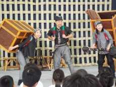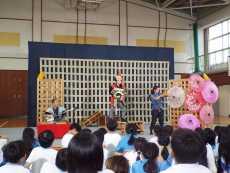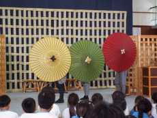 10月16日(木)に、劇団風の子中部のみなさんによる「ぱらりっとせ」の観劇会が行われました。大草保育園からも3名参観しました。「ぱらりっとせ」とは、「はないちもんめ」という意味だそうです。昔の遊びでは、お手玉、なわとび、竹馬、風車、和傘などが紹介されました。2本の大縄の中を軽々と二重とびで跳んだり、蛇の目傘での紙風船まわしをしたりと、どれもアッと驚く演技に、子どもたちから自然に大きな歓声や拍手が沸き起こりました。「はなさかこぞう」の昔話では、三味線や竹笛を入れた弾き語り、最後に蛇の目傘の花が咲きました。ハラハラドキドキの連続で、楽しい時間を過ごすことができました。