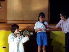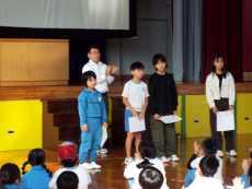 10月20日(月)に月曜朝会が行われました。今日の朝会は盛りだくさん。まず、キックボクシングの大会でチャンピオンになった児童に、チャンピオンベルトの披露をしてもらいました。そのあと夏休みの課題の詩・作文の表彰を行いました。そして、今日お話しをしてくれる先生は、岡本しず香先生でした。理科の先生らしく「動物の数え方」についてのお話でした。「1羽」「1匹」「1頭」・・・そういうことだったのかと勉強になりました。委員会からの連絡では、健康委員からトイレのスリッパの整頓についてのお話もありました。