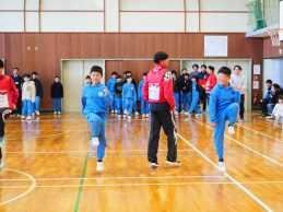 2月19日(木)にトヨタ自動車陸上長距離部の吉居大和選手含め5名と中央大学4年生の吉居駿恭選手を講師に、小学校訪問陸上教室を体育館で行いました。はじめに、6年生がアーチを作り選手のみなさんをお迎えしました。前半の「体づくり」は、4年生から6年生が参加しました。はじめに、大草小卒業生の吉居大和選手を先頭に体育館を3周ジョギングし、体ほぐしの体操をしました。その後、リズムをつかんで走る「腿上げ走」や自分のチームのフラフープの中にマーカーを3つ先に入れるという「マーカー取り」ゲームを行いました。「マーカー取り」では、自分の陣地のフラフープにマーカーを集めるために、仲間同士で声を掛け合ったり、相手の動きを見たりしながら自然と力いっぱい走るようになり盛り上がりました。走るのが苦手な子も好きな子も、楽しみながら速く走るこつを学ぶことができました。