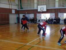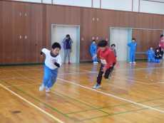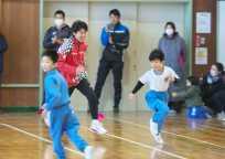 後半は、1年生から3年生が参加し、全校で「学年別」鬼ごっこを行いました。選手が鬼となり、はじめは一人で、時間になるともう一人鬼が入るという鬼ごっこです。全校で、7名の子ども達が残り、コーチの辻さんと吉居大和選手からタオルをプレゼントしてもらい大喜びでした。