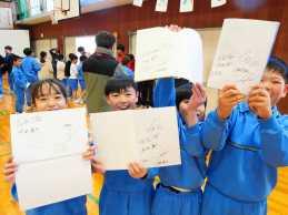 最後に子ども達から選手への質問タイムをしました。「大きい大会の前はどうしていますか。」という質問に対して吉居駿恭選手は、「試合前の緊張感とワクワク感を楽しむようにしている。その緊張感を乗り越えるために、それまでにしっかり練習したり、大会を楽しんだりするようにしている。」と答えていました。「大会前のルーティーン」についての質問に対して吉居大和選手は、「しっかり寝ること。いつも通り過ごすこと。消化の良い食べ物(うどん・バナナ)を食べている。」と答えてくれました。「陸上選手になったのはどうしてですか。」という質問に対しては、吉居大和選手は「両親の影響です。」吉居駿恭選手は、「走るのが得意だったから」と答えてくれました。「いつから速くなったのですか。」という質問がでました。吉居大和選手は、「小学校4年生からマラソン大会で優勝できるようになりました。中学校では全国大会に出られるようになりました。」吉居駿恭選手は、「小学校から負けず嫌いで練習していました。」と答えてくれました。「寝る時間」についての質問に対しては、吉居兄弟は「9時か9時30分に寝て、朝5時に起きる。8時間か7時間30分。」その他の選手は「10時30分頃寝て、朝5時頃起きる。7時間30分寝ている。」と答えてくれました。「今の目標は」という質問に対しては、吉居大和選手は、「アジアパラリンピックの日本代表になる」吉居駿恭選手は、「2年後のロサンゼルスオリンピックに出る」と抱負を話してくれました。
