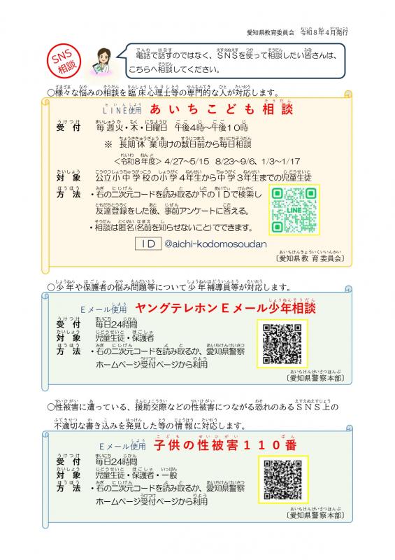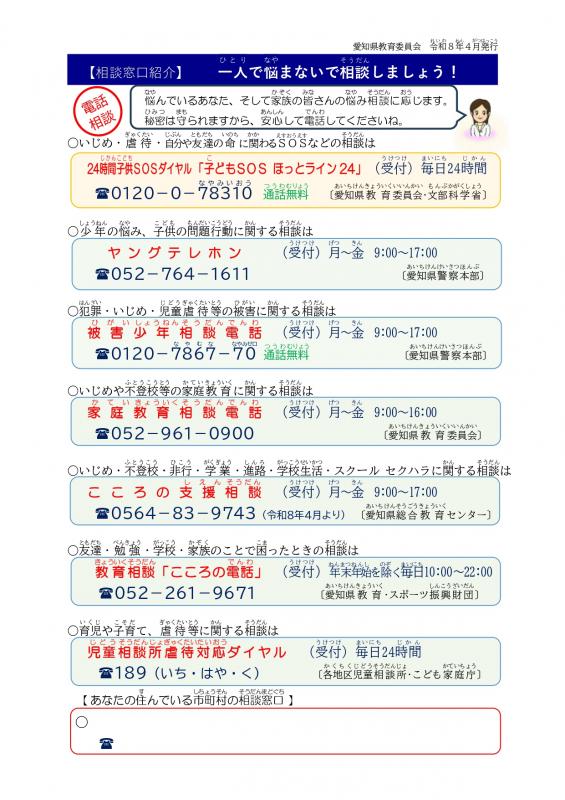 愛知県教育委員会では、24時間電話相談「子どもSOS ホットライン24」やSNS「あいち子ども相談」を始めとする相談窓口を紹介しております。