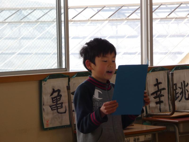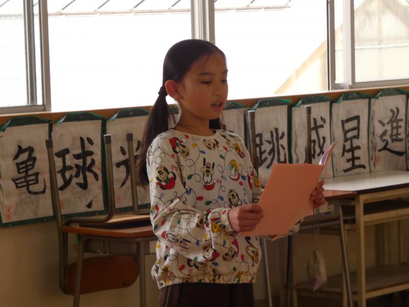 2年生と4年生の代表の子が2学期がんばったことを発表してくれました。二人ともこつこつと「挑戦」続け努力の成果を伝えてくれました。