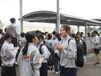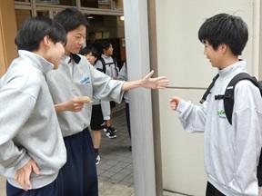 登校時、生徒昇降口前では生徒会役員と2・3年生の有志メンバーが、1年生を笑顔で出迎えます。そして、「おはようございます」という挨拶とともに、じゃんけんをしたり自己紹介をしたりと、学年を越えた温かい交流が行われます。