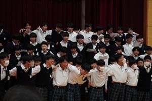 予餞会では、生徒会が中心となり、1・2年生が「どうすれば3年生に喜んでもらえるか」を真剣に考え、準備を進めてきました。生徒会執行部による寸劇とダンスで始まり、1・2年生からは、ダンスや演舞、劇やクイズ、3年生へのプレゼントや学年合唱が披露され、その思いが込められていました。お世話になった先生からのビデオレターもあり、最後に全校生徒で輪になって「3月9日」を歌いました。3年生は笑顔で楽しみ、大きな拍手で答えていました。その姿があったからこそ、会場は一体となり、温かな雰囲気に包まれました。感謝の気持ちを伝えようとする在校生の思いと、それを誠実にうけとめる3年生の姿がありました。互いを思いやる心があふれた、東部中学校らしい心温まる素晴らしい時間となりました。