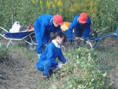 始めに、5・6年生がさつまいものつる切りをしました。