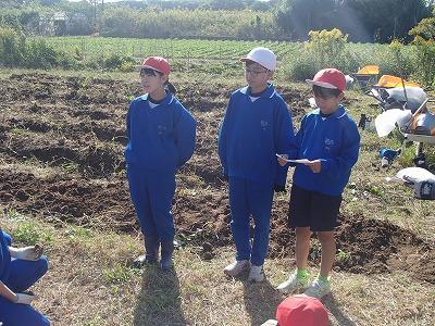 健康・環境委員の説明を聞き、縦割り班ごとに植えたさつまいもを掘りました。