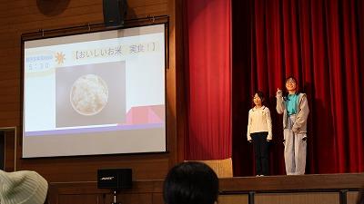 総合学習で学んだ米作り「田植え・タニシ駆除・稲の刈り取り・脱穀」の苦労を劇で演じました。