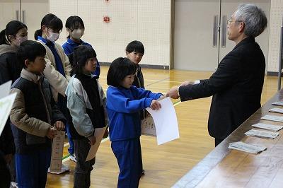 1月27日朝会。なわとび大会入賞者の表彰を行いました。