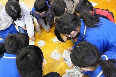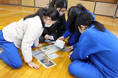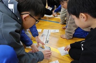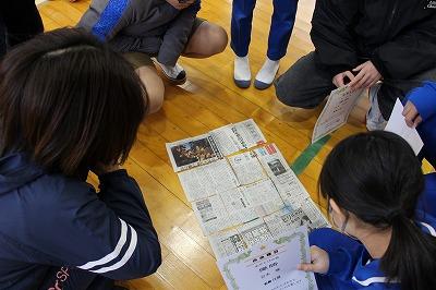 お話の後、縦割り班で集まり、新聞の1面を並べて完成させるパズルゲームをしました。