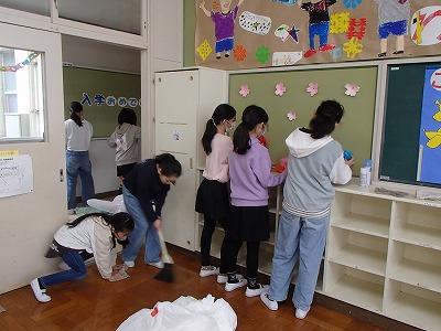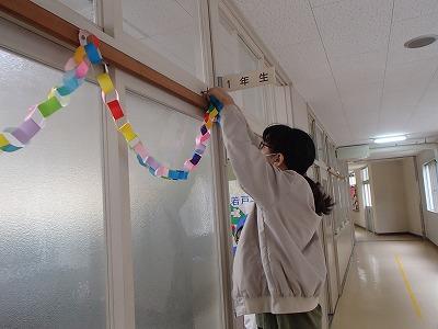体育館の設営や校内の清掃、1年生の教室・廊下の飾り付けなどしました。