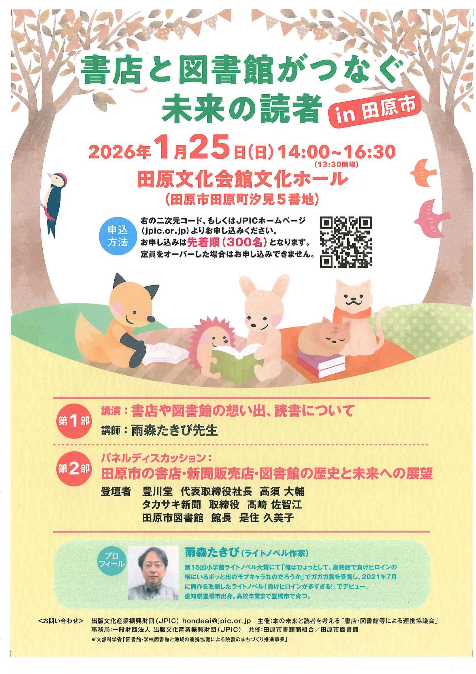 本の未来と読者を考える「書店・図書館等による連携協議会」が主催する「書店と図書館がつなぐ未来の読者in田原」のチラシです。1月25日(日)に田原市文化会館文化ホールにて開催されます。 |